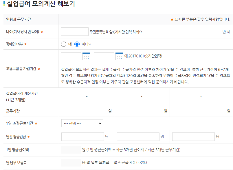 고용노동부 홈페이지에서 확인이 가능합니다. 주민등록번호 6자리 입력하시구요. 장애인 여부 확인해주시구요. 고용보험 총 가입기간, 입사일 부터 퇴사일표시 해주시면 됩니다. 그리고 1일 소정근로시간에 시간 체크하시구요 월간 평균임금을 확인해주세요. 직전 3개월 급여를 쓰면 됩니다.