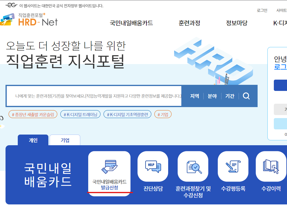 직업훈련포털 HRD-Net에 접속합니다. 메인에 보이는 국민내일 배움 카드 발급신청을 눌러주세요. (해당 서비스 이용을 위해서는 로그인이 필요하니 아이디가 없으시다면 회원가입 진행 후 발급신청을 눌러주세요.