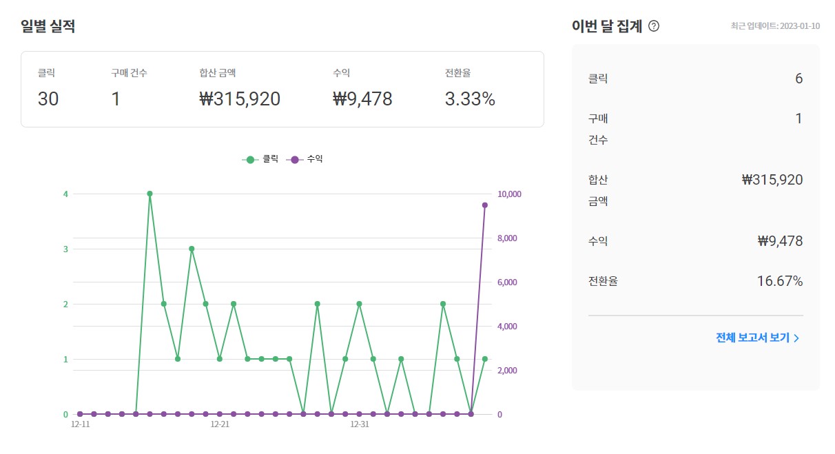 이번에 처음 난 제 수익입니다. 9,478원을 벌었어요. 제 링크로 구매하신 분이 315,920원을 구매하셨네요. 구매 1건에 315,920원입니다. 저번에 애플워치 후기 등을 포스팅했었는데, 거기서 수익이 발생했더라고요.