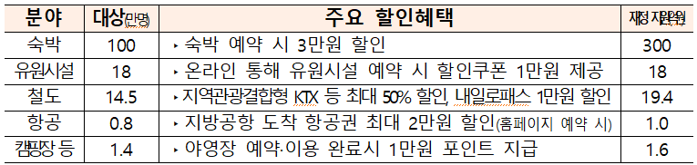 숙박과 레저활동 등 필수 여행비 할인과 국내휴가비 지원에 투입되는 재정은 총 600억원 규모라고 합니다.