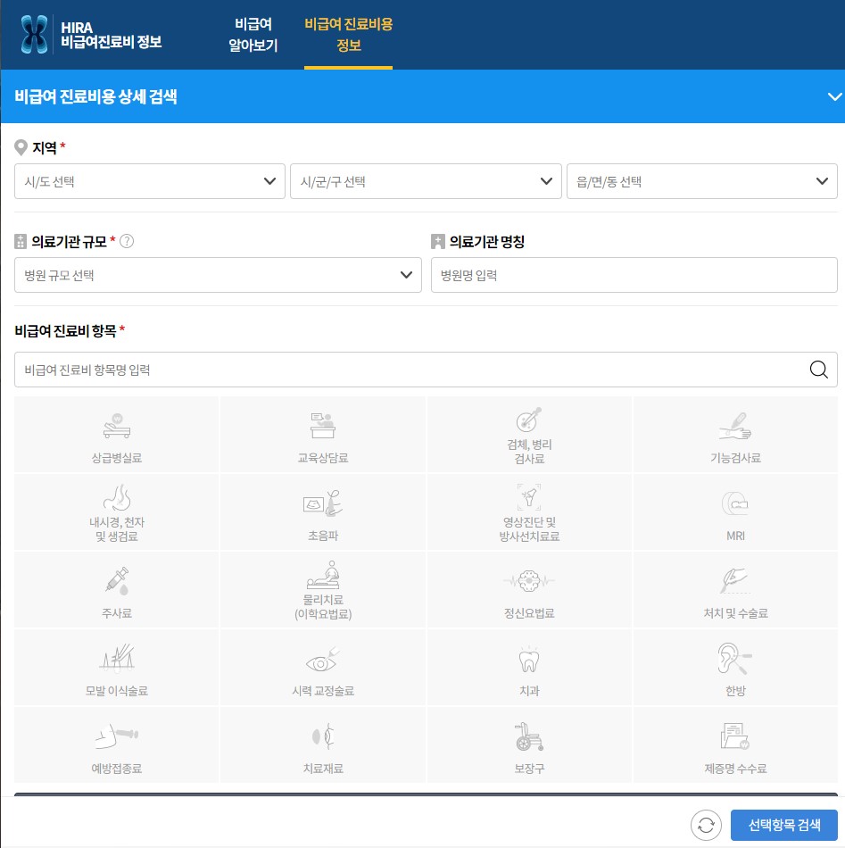 지역별 평균 임플란트 가격을 확인 하는 방법도 있습니다. 바로 건강보험심사평가원에서 확인 하는 방법인데요. 들어가보면 아래의 화면이 나올 텐데요. 그럼 여기서 지역, 의료기관 규모, 비급여 진료비 항목 선책하시면 됩니다.