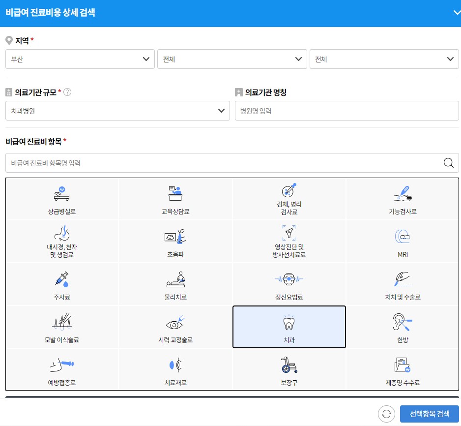 위처럼 지역 체크하시고, 의료기관 규모 선택하시고 아래 진료비 항목에 치과를 체크하시면 됩니다. 쉽죠?