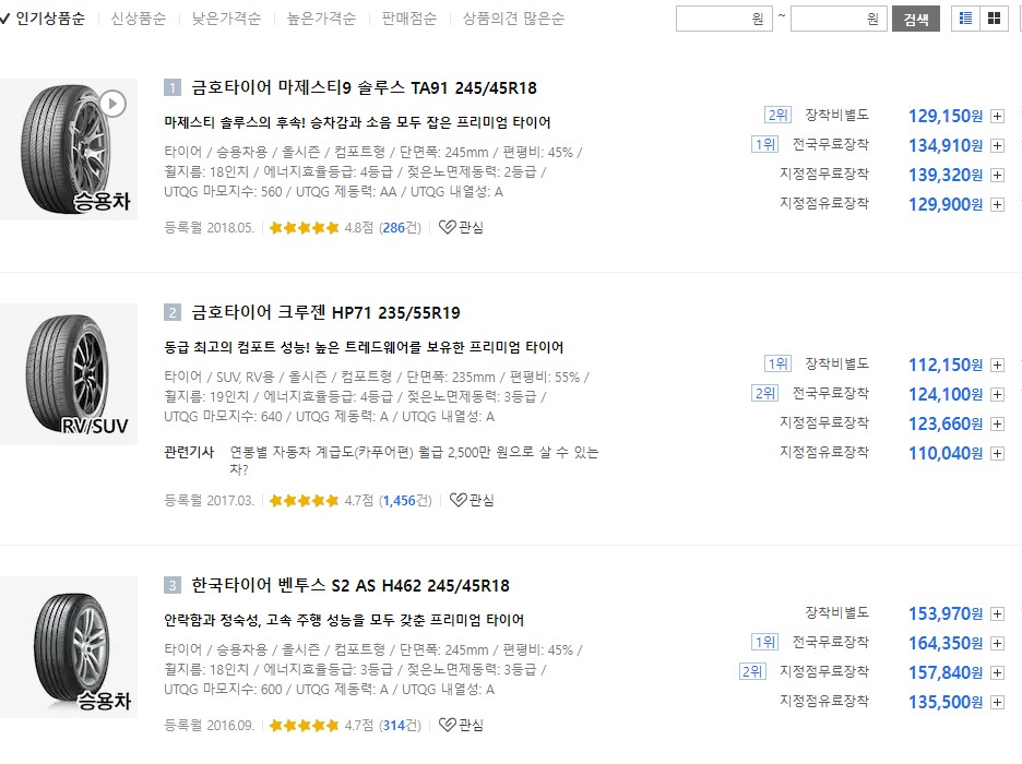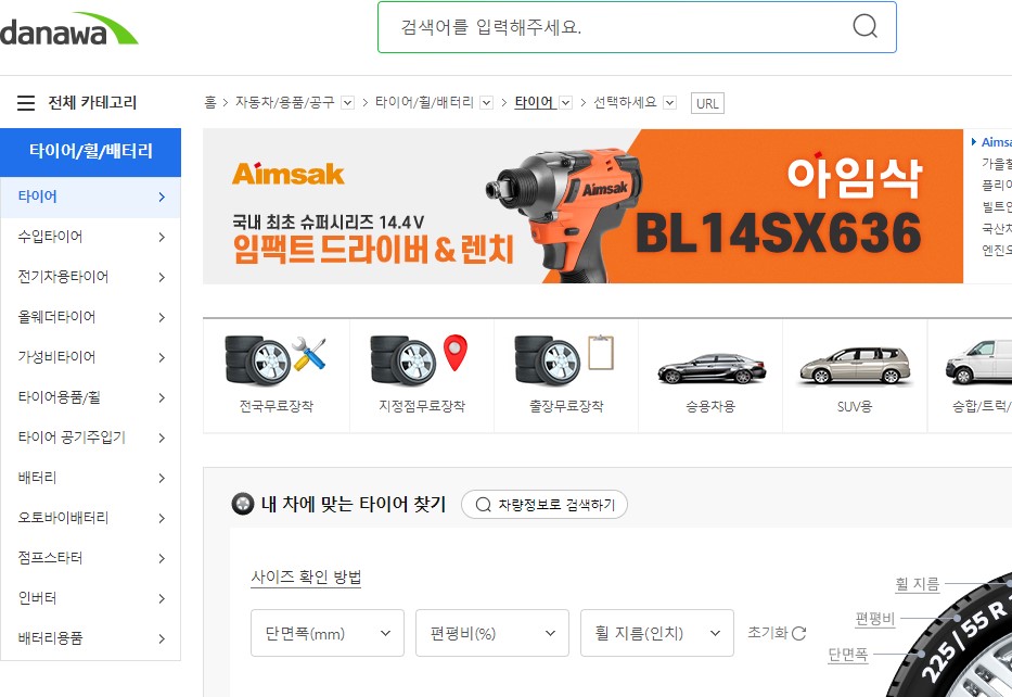 다나와는 판매처들의 가격을 비교해서 한눈에 보여줘서 보기 편합니다. 최저가 확인이 바로 가능하거든요. 다나와 사이트에서 판매 사이트로 들어간뒤 타이어를 구매하셨다면 들고 타이어를 무료나 저렴하게 바꿔주는 곳에 가셔서 교체하시면 됩니다. 무료로 해주는 곳은 거의 없고 얼마의 공임비가 들거에요.