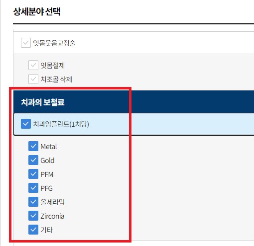 [치과]를 눌러주시고 상단에 [의료기관 규모], [의료기관 명칭]을 체크해주시고 오른쪽과 같이 [치과 보철료]를 체크해주세요. 마찬가지로 다니는 병원이나 방문하려는 병원이 있으면 평균 가격에 대해 확인해보시면 될 것 같습니다.