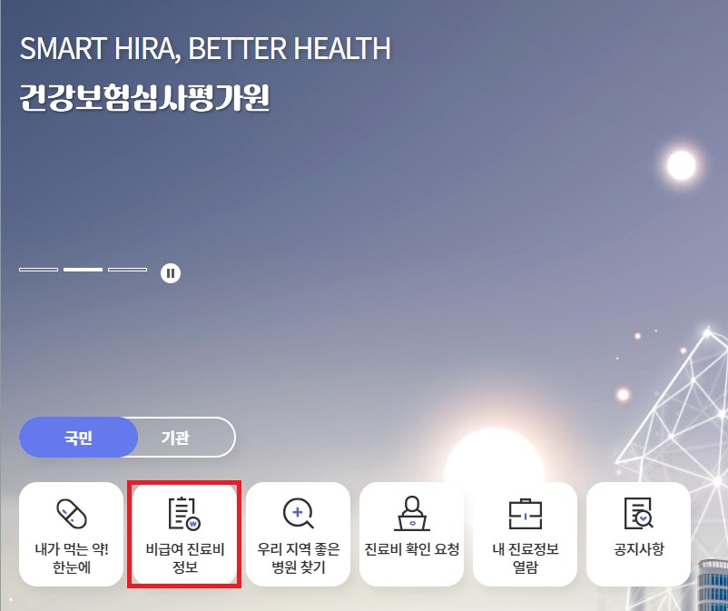 홈페이지 접속 후 [비급여 진료비 정보]를 눌러주세요. 그럼 오른쪽과 같은 화면이 뜹니다. 상단에 비급여 진료비용 정보를 눌러주세요. 그럼 아래와 같은 화면이 뜨는데요.