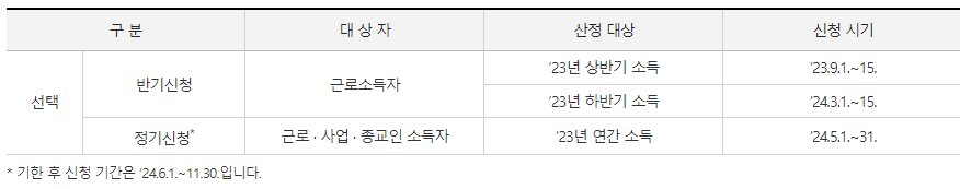 * 근로소득만 있느 ㄴ자는 반기신청과 정기신청을 선택해 신청할 수 있고, 사업 또는 종교인 소득이 있는 자는 정기신청을 하셔야합니다.