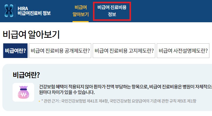 1. 홈페이지 접속 후 비급여 진료비 정보를 누릅니다