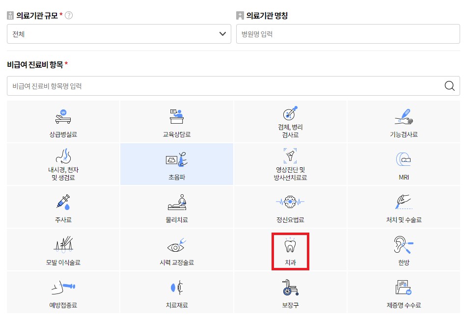 2. 의료기관 규모 등을 확인 후 치과를 눌러주며, 치과보철의 임플란트를 누르면 각 병원들의 평균가격이 나옵니다.