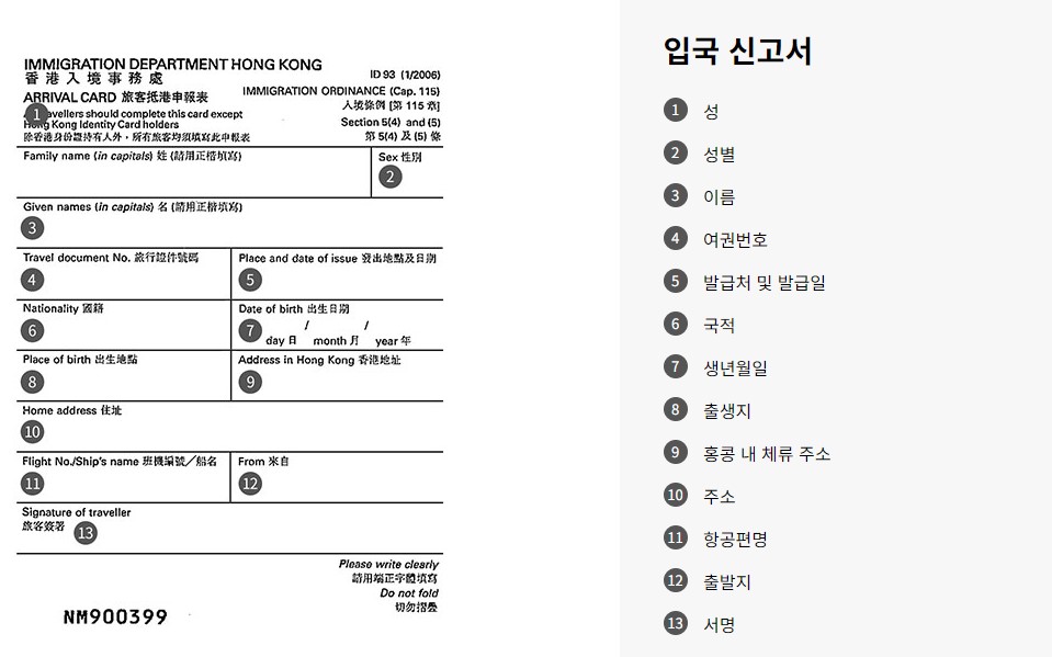 홍콩 입국신고서 작성