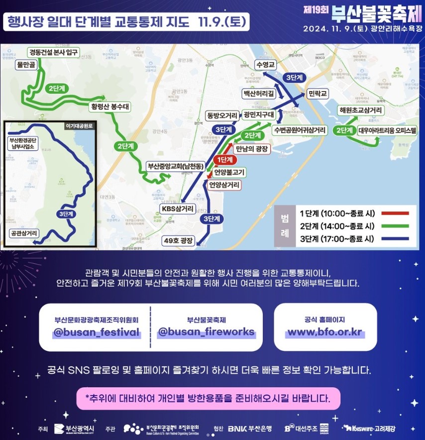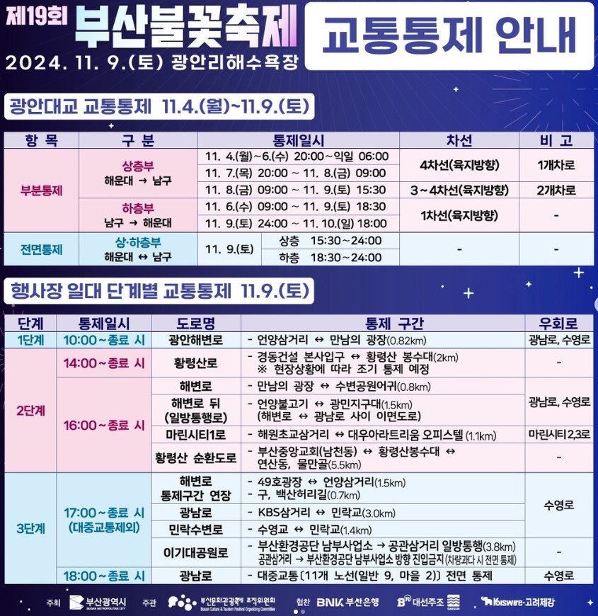 매년 광안리해수욕장을 화려하게 수놓는 부산불꽃축제가 어느덧 19회를 맞이하였다. 2005년 APEC정상회의 기념행사 일환으로 시작돼, 해를 거듭할수록 세계적인 관심을 받으며 부산 대표 축제로 자리매김하였다. 부산에서만 볼 수 있는 초대형 불꽃과 광안대교 경관조명을 활용한 미디어파사드 연출, 화려한 불꽃과 조명, 음악이 어우러져 스토리텔링이 가미된 부산멀티불꽃쇼를 만나볼 수 있다. 또한 광안리 해수욕장뿐만 아니라 동백섬, 이기대 앞까지 "3 point" 연출로 다양한 장소에서 불꽃쇼를 관람할 수 있다.