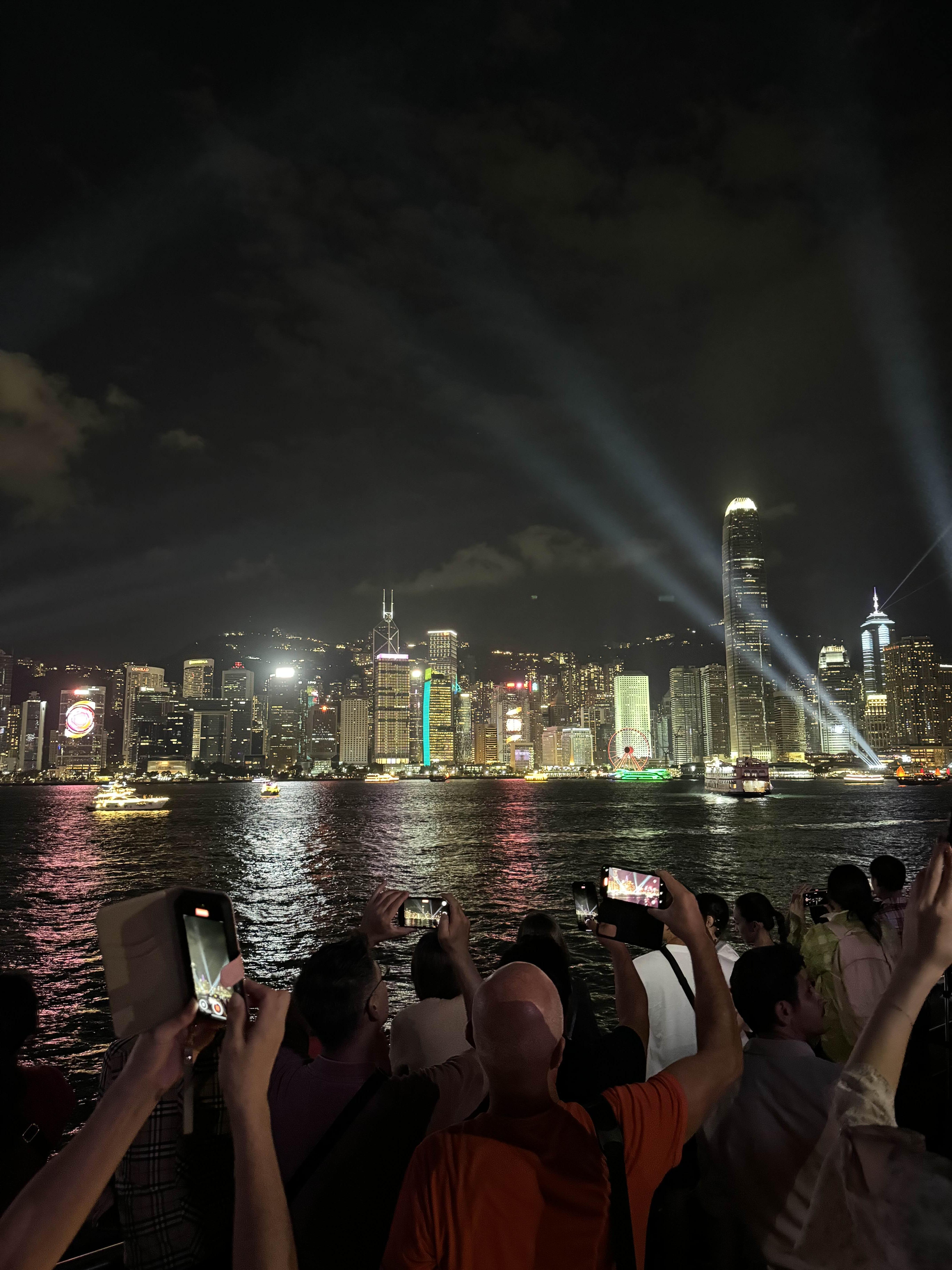 밤에 여기서 야경을 보자는 말에 아무생각 없이 친구 따라온 이곳, 꼭 봐야하는 리스트중에 있다고 하는데 저는 솔직히 잘 모르겠더라구요. 침사추이 시계탑을 지나서 오면 다리위로 올라가서 다들 구경을 하는 것 같아요. 20시에 쇼 시작을 하는데요. 그냥 노래 조금 나오다가 레이저라고 해야할까요? 그냥 빛이 몇가닥씩 올라옵니다. 그게 끝입니다.