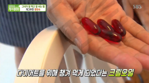 15일 방송된 SBS 생방송 투데이의 그녀가 잘 먹고 잘 사는 법 코너에 팽현숙이 풀연해 다이어트 비법을 전했습니다. 팽현숙은 중년이 되면서 내장지방이 잘 빠지지 않는 다며 지방을 빼기 위해 크릴 오일을 섭취한다고 말했습니다.