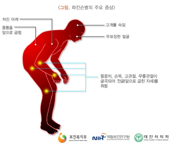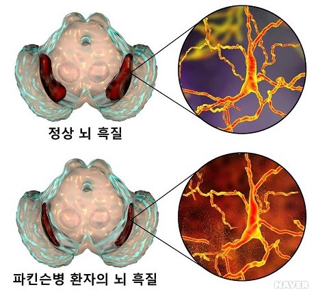 파킨슨병은 치매, 뇌졸중과 함께 3대 노인 질환으로 잘 알려져 있는 병입니다. 신경계 퇴행성 뇌질환으로 신경전달물질인 도파민을 분비하는 중뇌 흑질 신경세포가 소실되어 생기는 것으로 밝혀졌으며 운동기능 장애를 일으킨다고 합니다.