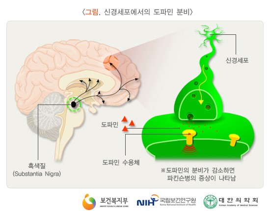 즉, 신경전달물질인 도파민 신경세포가 부족해질 경우 파킨슨병이 발생하게 된다고 합니다. 우리 뇌에는 다양한 신경 물질이 존재하는데 그중에서도 운동에 있어서 필요한 도파민이라는 신경전달물질이 있는데, 이 도파민은 중뇌에 위치한 흑질에서 분비하는데 이 흑질 신경세포가 원인 모르게 서서히 소실되어 도파민이라는 신경전달물질도 자연스럽게 부족하게 되면서 다영한 운동장애가 발생하게 되는데 이것을 파킨슨병이라고 합니다.