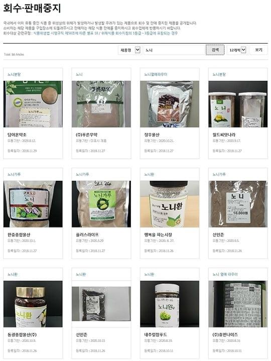 서울시에서 작년 10월23일~31일 국내 온라인 재래시장 등에서 판매중인 노니 제품을 27건을 수거해서 시 보건환경연구원에서 분석한 결과 9건에서 쇳가루 기준치를 최소 6배에서 최대 56배를 초과한 것으 로 나타났다고 합니다. 해당 제품은 식품의약품안전처 홈페이지 식품안전나라에서 확인할 수 있으며 기준과 규격에 부합하지 않아 회수, 판매중지된 제품입니다. 참고해서 만약 드시고 계신게 있다면 바로 섭취를 중단하세요.