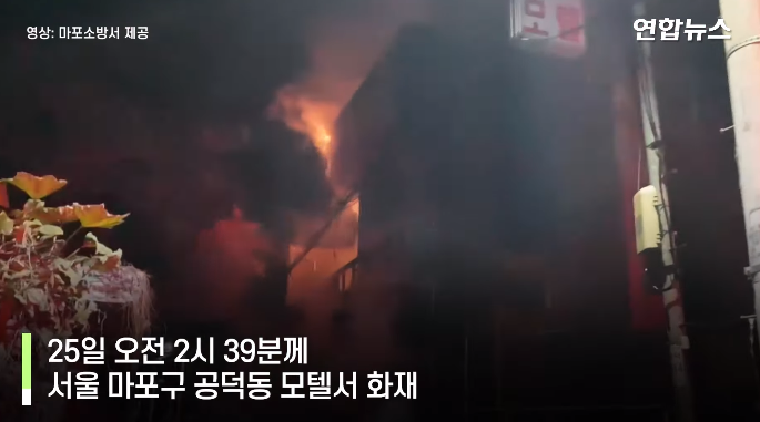 25일 오전 2시 39분경 서울 마포구 공덕동의 한 3층짜리 모텔 건물 1층에서 화재가 발생해 2명이 숨지고 9명이 부상을 당했다고 합니다.