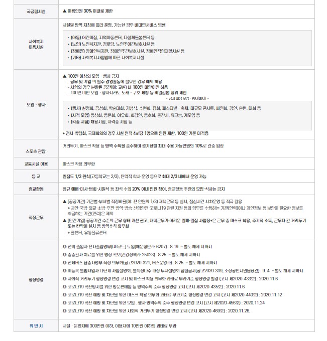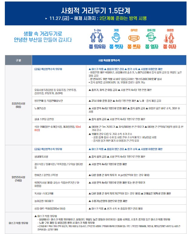 27일 0시부터 유흥시설, 노래연습장, 식당, 카페 등등 9종의 중점관리시설은 마스크 착용, 출입자명부 작성 등 핵심 방역 수칙 위반 시 윈스트 라이크 아웃제를 적용받는다고 합니다. 시험과 공무, 기업 필수 경영활동을 제외하고 100인 이상의 모임과 행사는 금지된다고 합니다.