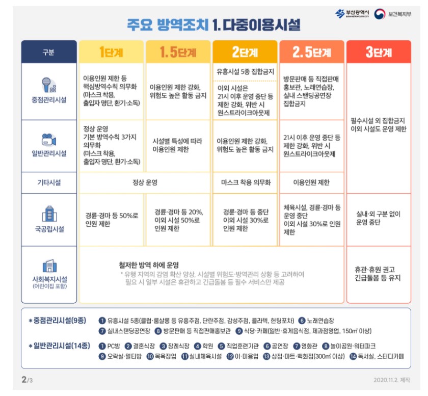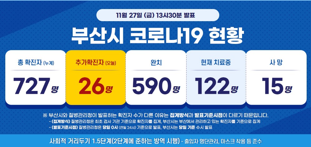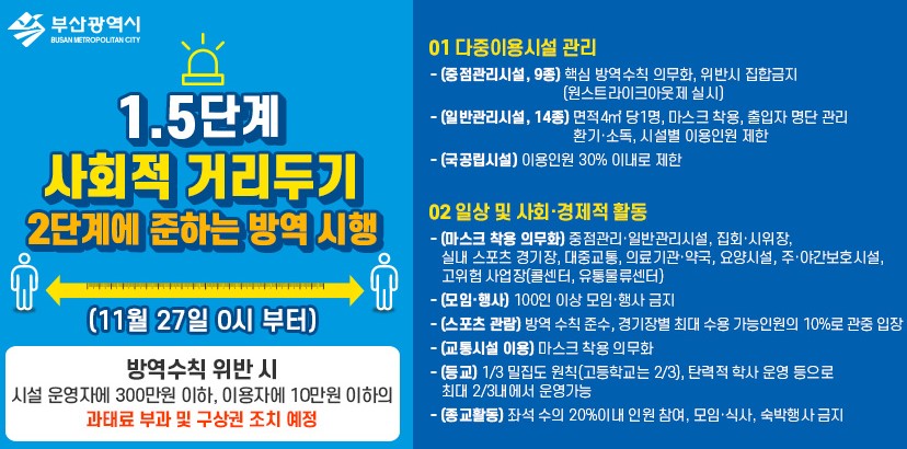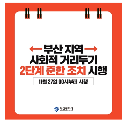 코로나 19 지역 감염이 확산되면서 부산시가 27일 0시부터 2단계에 준하는 사회적 거리두기를 실기한다고 합니다. 변성완 부산시장 권한대행은 26일 오후 브리핑에서 24일부터 1.5단계에 준하는 방역조치를 취해오고 있었지만 보다 강력한 조치가 필요한 상황이라며 전국 사회적 거리두기 단계 격상에 앞서 자체적으로 사회적 거리두기 2단계에 준하는 조치를 시행하겠다고 밝혔습니다.