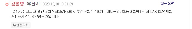 12월18일(금) 기준으로 코로나19 신규확진자 35명(사하구3, 부산진구2, 수영구2, 해운대구2, 동구2, 남구3, 동래구2, 북구1, 강서구2, 사상구3, 연제구2, 서구1, 타지역1, 요양병원2) 발생이라고 합니다.