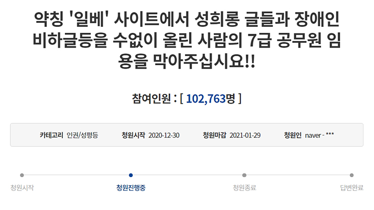 해당 공무원 임용을 막아달라는 청와대 국민청원에는 동의자가 약 20만명을 넘어섰다고 합니다.