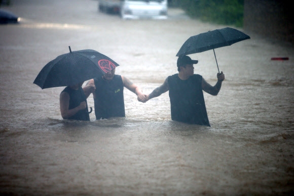 허리까지 차오른 빗물에 시민들이 손을 잡고 도로를 건너거나 차를 밀어주고, 배수구를 찾는 모습이 목격되기도 했으며 소방서 인근 도로에는 낙석이 발생했다.