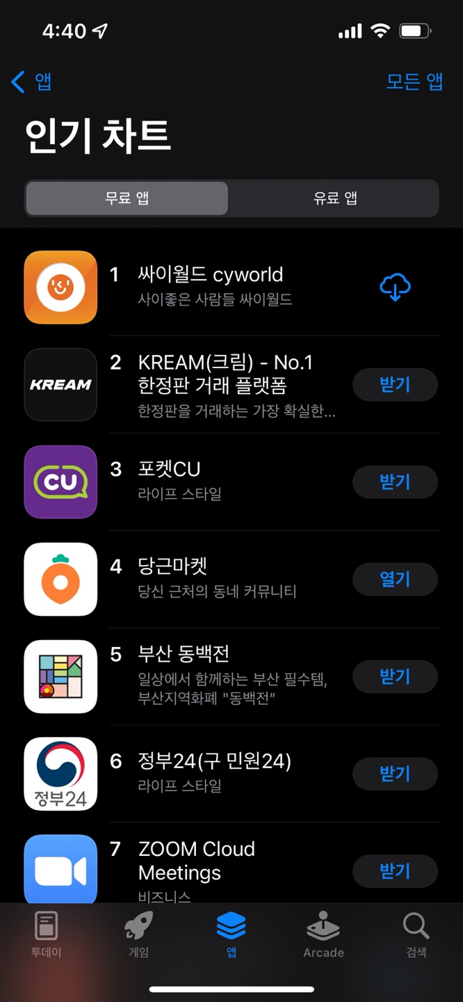 아이폰은 싸이월드가 인기순위 1위더라구요