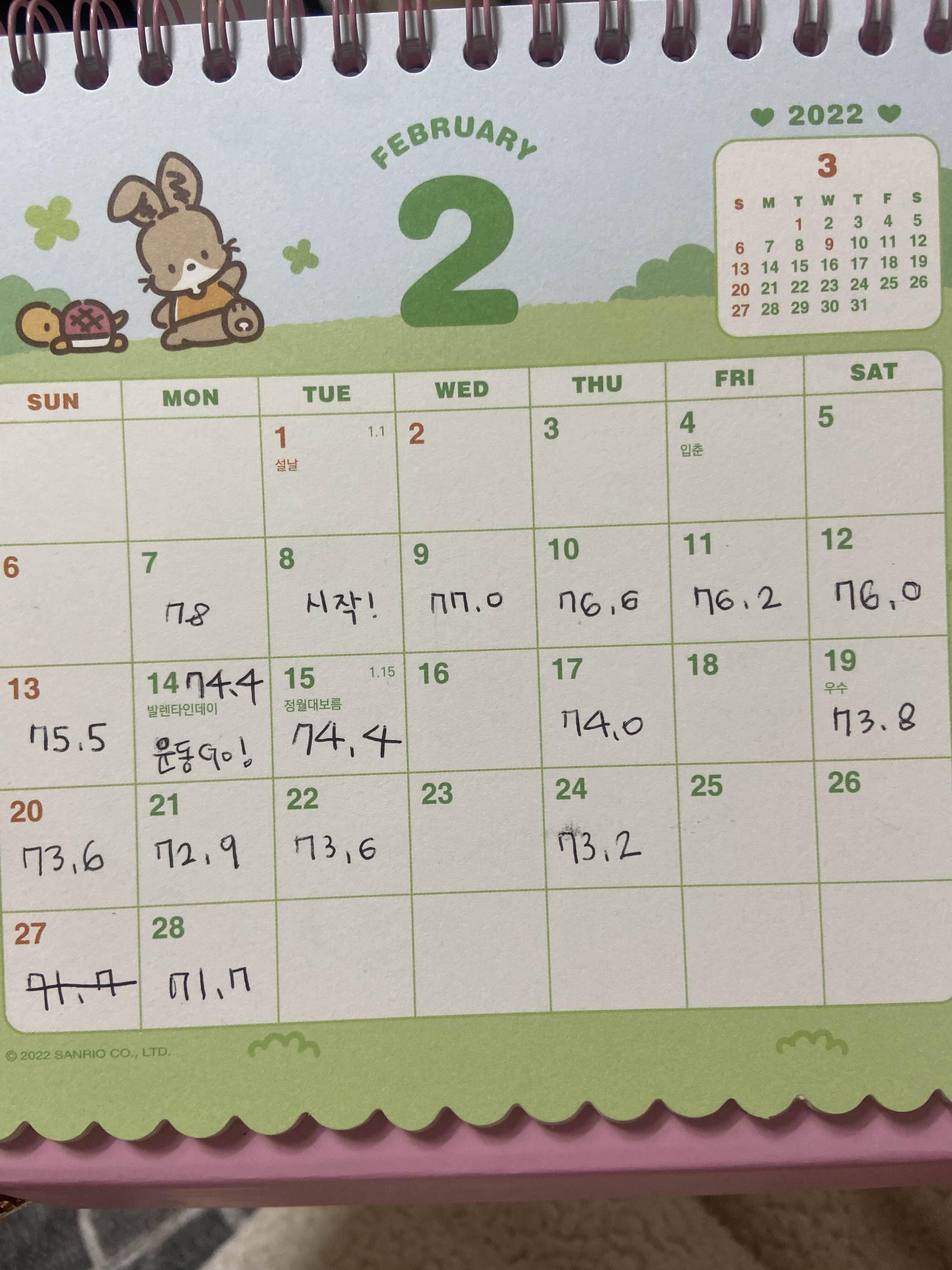 달력에 몸무게를 적어놨다.