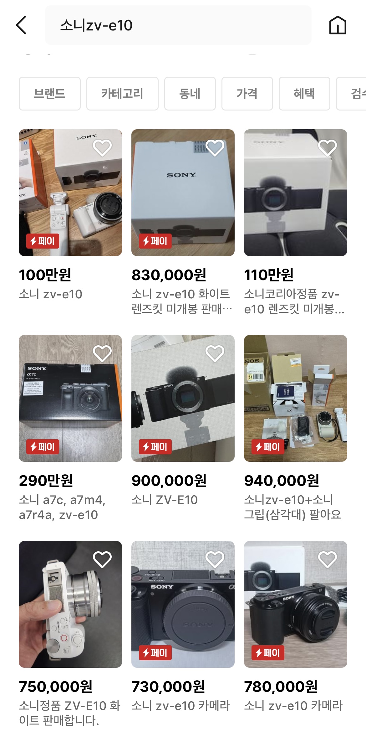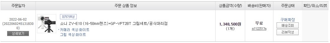6월 초 기준 그립 포함 1,348,500원 주고 구매했다. 저 당시에는 저게 최저가였다. 구매 후 역시나 손이 잘 안갔다. 이 미러리스 카메라 구매전에는 소니zv-1 디카를 사용했는데, 배터리가 너무 빨리 닳는것 빼곤 그냥 그 디카가 나았다는 생각이 들며 zv-e10을 팔려고 내놨다.