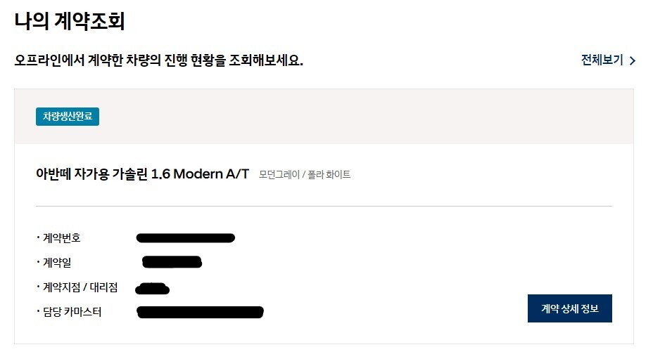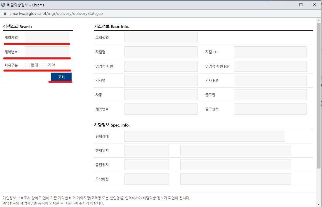 그럼 위와 같은 화면이 뜹니다. 계약자명, 계약번호, 회사구분에 체크하시고 조회하시면 차량정보 확인이 됩니다. 혹시 계약번호를 모르겠다 하시면 현대자동차 홈페이지에 들어가서 나의 계약조회라는 메뉴에서 확인 가능합니다.
