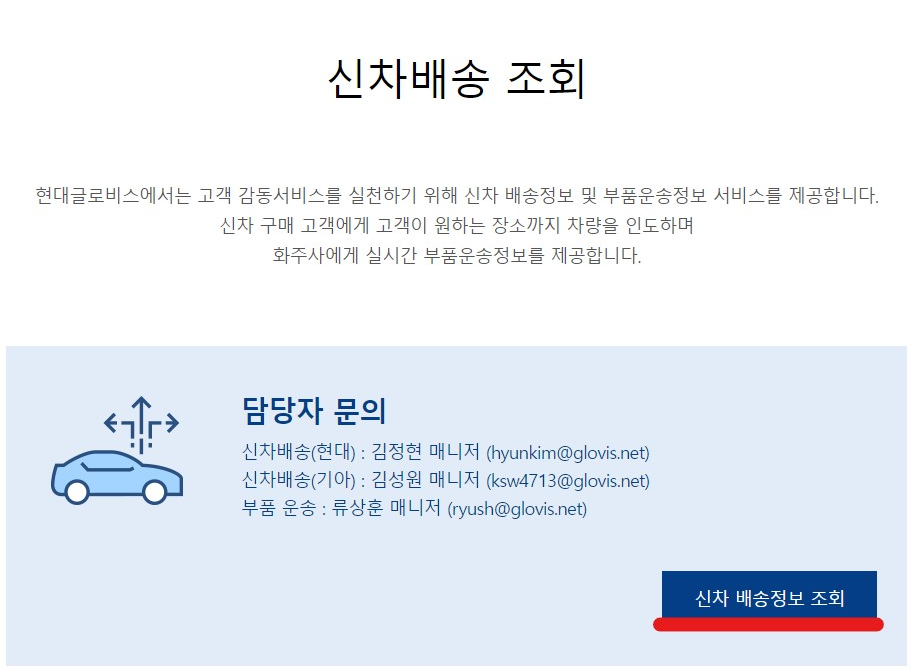 현대: 김정현 매니저(hyunkim@glovis.net) 기아: 심성원 매니저(ksw4713@glovis.net) 부품운송: 류상훈 매니저(ryush@glovis.net) |